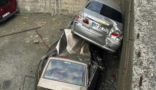 Edinilen bilgilere göre, A.A.’nın kullandığı 67 DZ 751 plakalı otomobil rampayı çıkmak isterken bir anda geriye doğru kaydı. Sürücünün direksiyon hâkimiyetini kaybetmesiyle araç, yaklaşık 8 metre yükseklikten istinat duvarını aşarak alt bölümde park halinde bulunan bir otomobilin üzerine düştü.
