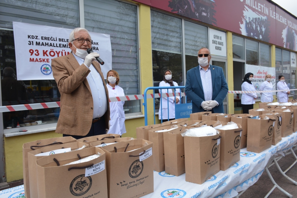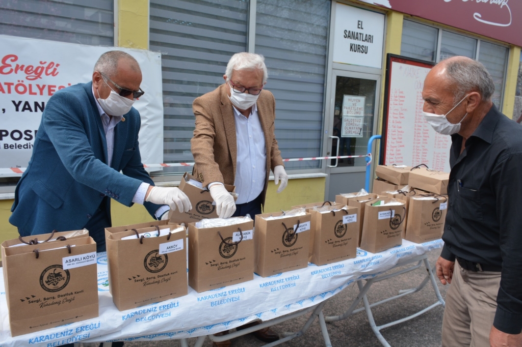 Salgının ilk günlerinden itibaren harekete geçen Kdz. Ereğli Belediyesi’nin Cumhuriyet Halk Evi atölyelerinde gönüllülerle birlikte ürettiği maskeler köy muhtarlarına teslim edildi.