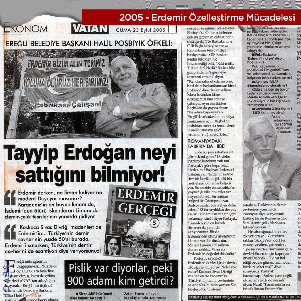 Kdz. Ereğli Belediye Başkanı Halil Posbıyık’ın 1994’de göreve başladığı yılın hemen ardından, kentimizin gözbebeği Erdemir 1995’de özelleştirilmeye çalışıldı. Buna karşı çıktık. İlçe temsilciler kurulu kurularak, yürüyüşler, eylemler yapıldı. Dönemin siyasilerini tek tek ziyaret edildi, haklı mücadele dile getirildi. 1995- 1997 yılları arasında tüm Türkiye’ye örnek bir mücadele ortaya olduk ve özelleştirme engellendi.