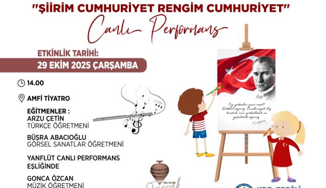 Cumhuriyet’in 102. yılına özel olarak düzenlenecek etkinlikler kapsamında Kdz.Ereğli Belediyesi Oyuncak Müzesi tarafından 29 Ekim Çarşamba günü Amfi Tiyatro’da “Şiirim Cumhuriyet, Rengim Cumhuriyet“ isimli canlı performans etkinliği gerçekleştirilecek. Kdz. Ereğli Belediyesi tarafından Cumhuriyet’in 102. yılına özel olarak düzenlenecek etkinlikler kapsamında Oyuncak Müzesi’nde, “Şiirim Cumhuriyet, Rengim Cumhuriyet “ isimli canlı performans etkinliği gerçekleştirilecek.