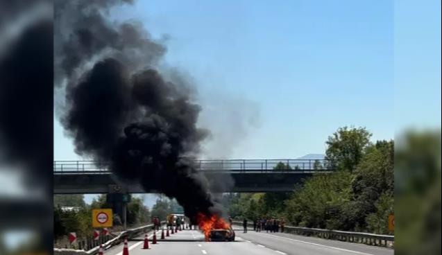 Düzce'de seyir sırasında alev alan otomobil, Anadolu Otoyolu'nun ortasında yandı. O anlar kameraya yansırken, yangın itfaiyenin müdahalesi söndürüldü.