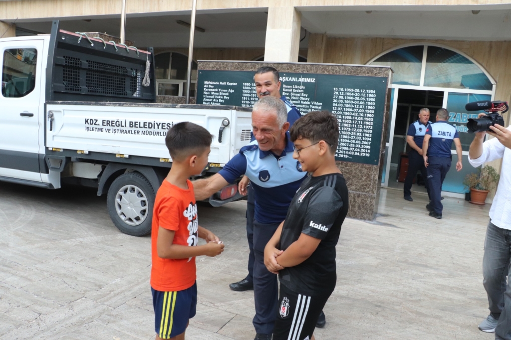 Olay, ilçeye bağlı Bağlık Mahallesi Kayalık Sokak üzerinde bulunan Nimet İlköğretim Okulu bahçesinde meydana geldi. Okul bahçesinde top oynayan Çınar Toprak Aksakal (10) ve Poyraz Yılmaz (10) okul bahçesinde top oynarken çanta buldular. Çantada yüklü miktarda para olduğunu fark eden çocuklar çevredeki vatandaşlardan yardım isteyerek polis ekiplerine ihbarda bulundu. Polis ekipleri yaptıkları araştırma sonucunda kayıp çantanın sahibinin Hüseyin Ilgın olduğunu tespit etti. Çantanın teslimi için çocukları aileleriyle beraber Kdz. Ereğli Belediyesi Zabıta Müdürlüğü’ne götürdü. Kayıp çantanın sahibi Hüseyin Ilgın zabıta ve polis ekipleri eşliğinde çantasını teslim alırken çantayı bulan çocuklara para vererek teşekkür etti. Ayrıca Ereğli Belediyesi Zabıta Müdürü Halit Aydın’da çocuklara teşekkür ederek ailelerini böyle bir çocuk yetiştirdikleri için tebrik etti.