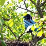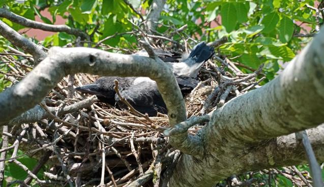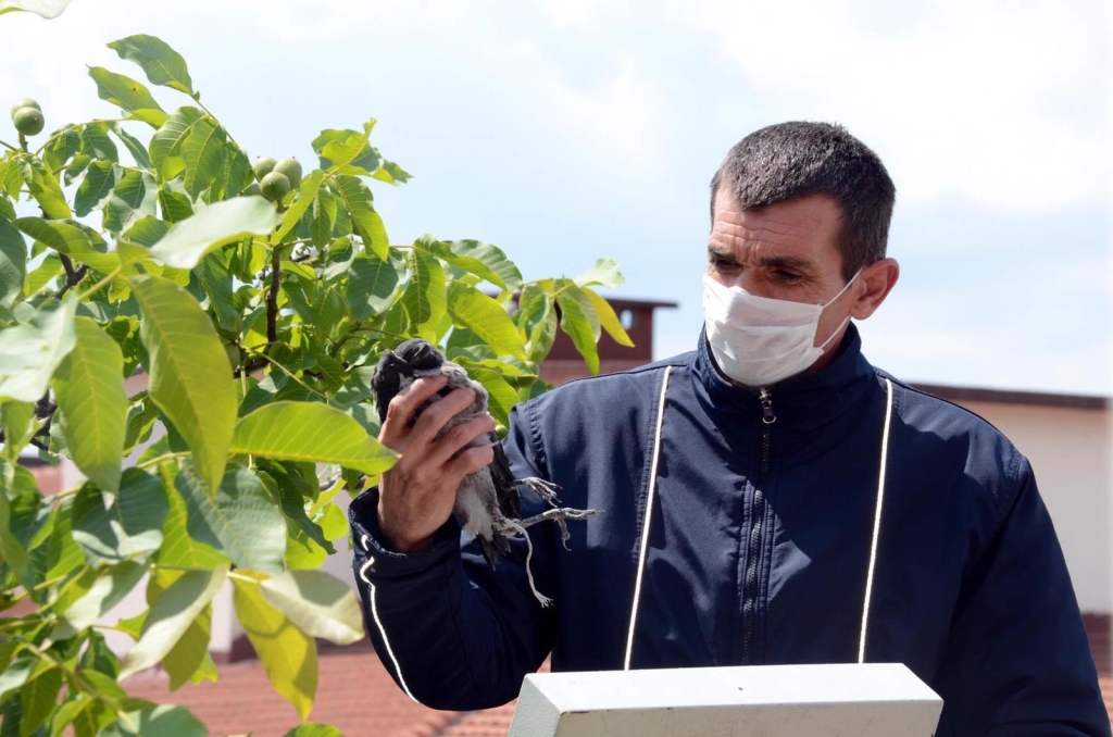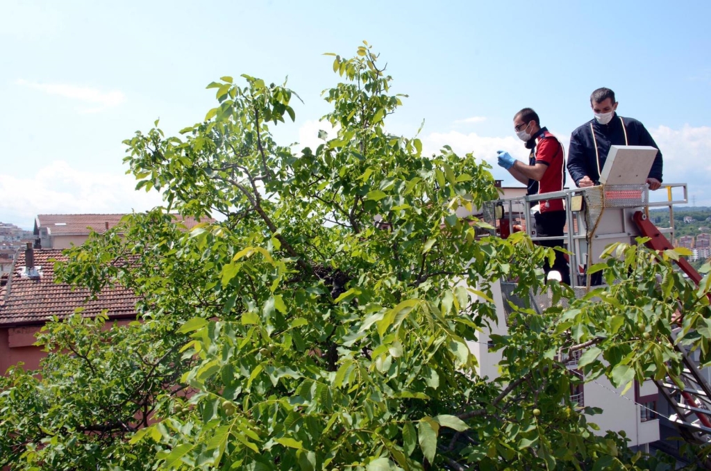 Alaplı Belediyesi İtfaiye Müdürlüğü'ne bağlı ekipler, yangın merdiveniyle karganın yuvasına ulaştı. Ayağına dolanan ipten kurtarılan karga, sağlık kontrolünün ardından yuvasına bırakıldı.