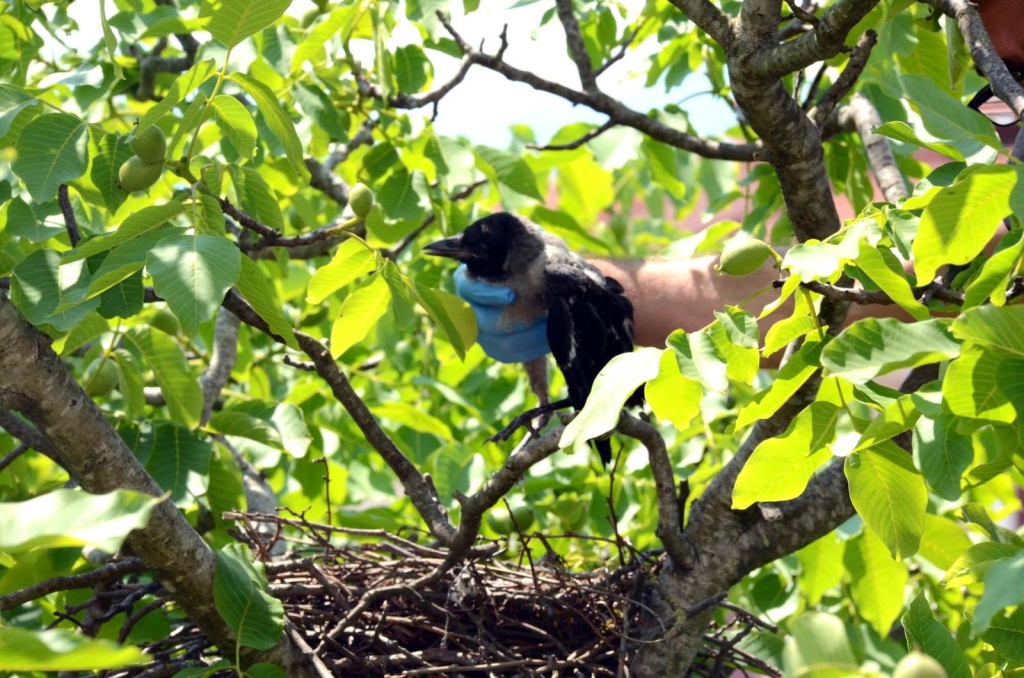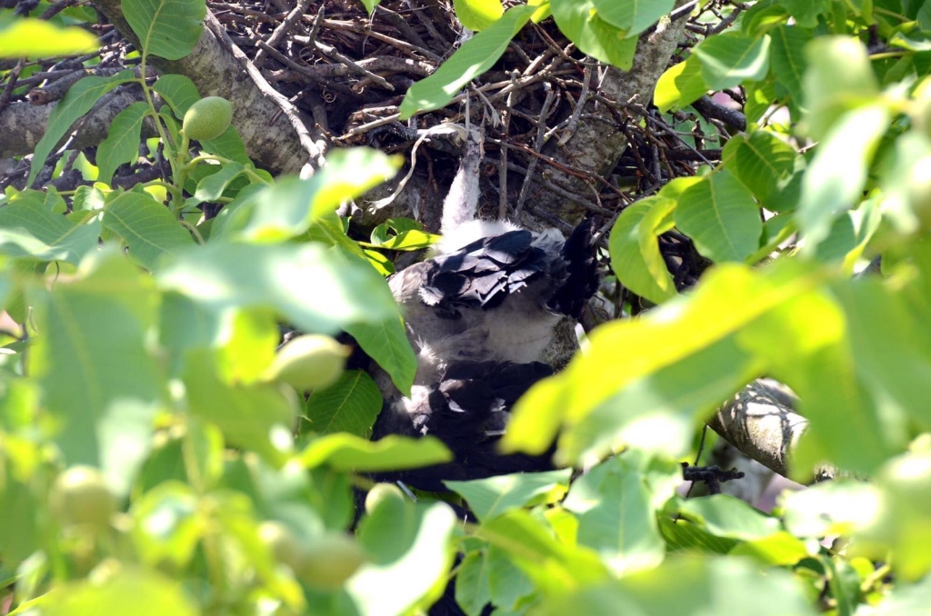 Zonguldak'ın Alaplı ilçesinde, yuvasında ayağına dolanan ip nedenyle mahsur kalan yavru kargayı itfaiye ekipleri kurtardı.