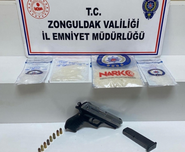 Narkotik operasyonu kapsamında M.S ve O.T isimli (2) şüpheli yakalandı. Operasyonda ölümcül etkiye sahip (225) gram uyuşturucu madde, (1) adet tabanca ve (8) adet mermi ele geçirildi. M.S ve O.T isimli şüphelilere Uyuşturucu veya Uyarıcı Madde Ticareti Yapmak suçundan adli işlem yapılarak gözaltına alındı. Zonguldak Cumhuriyet Başsavcılığına sevk edilen M.S ve O.T isimli şüpheliler tutuklanarak cezaevine