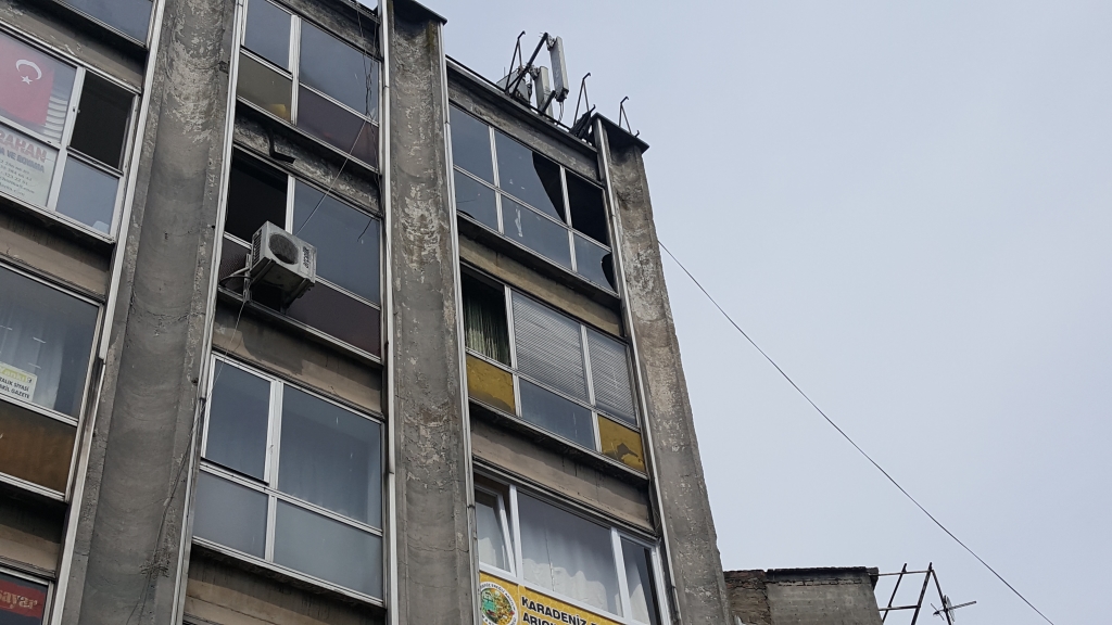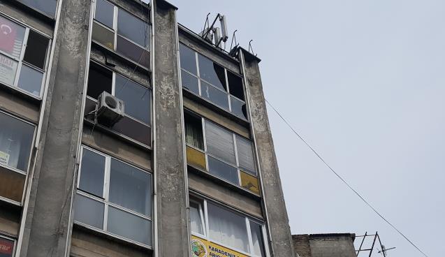 Zonguldak’ın Ereğli ilçesinde iş merkezinin kırık camları tehlike saçıyor.