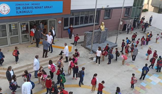 Tüm okullarda olduğu gibi Zonguldak’ta Dr. Derviş Nihat Arkat İlkokulunda dezenfeksiyon işlemi yapıldı. Öğrencilere üç hafta içerisinde ücretsiz maske dağıtımı yapılacak ayrıca tüm okullarda ateş ölçer bulundurulacak. Tüm okullarda Sağlık Bakanlığı rehberindeki prosedürler uygulayacak. Olası bir risk durumunda öğrencinin temas ettiği öğrenciler için de uyarı bildirimi yapılarak tedbir alınacak. Yüzyüze eğitim ile aylar sonra öğrenciler okullarına ve arkadaşlarına kavuşmanın mutluluğunu yaşadı.