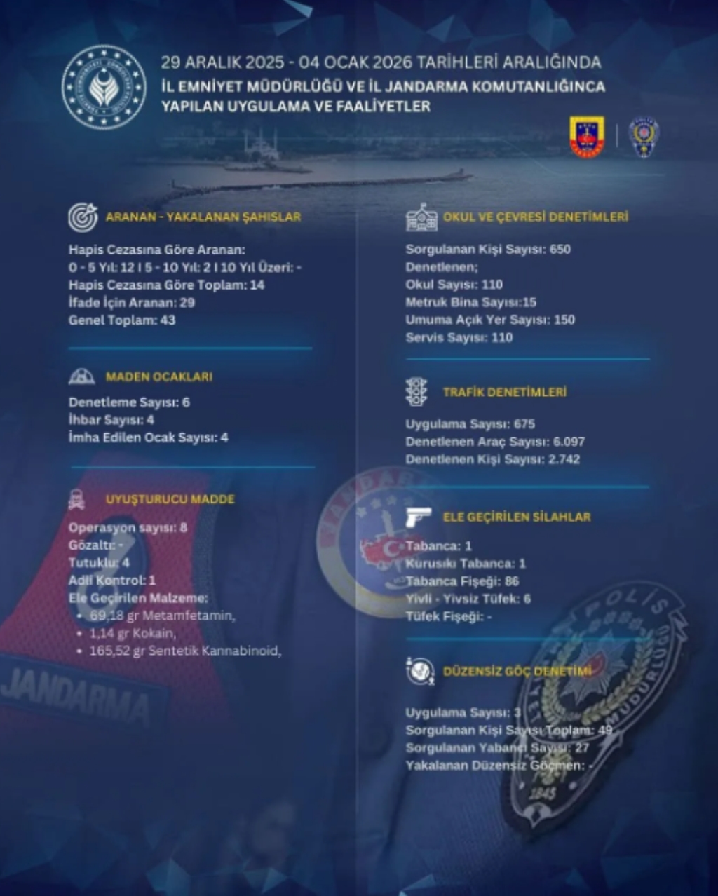 Zonguldak Valiliği, İl Jandarma Komutanlığı ve İl Emniyet Müdürlüğü’nce 29 Aralık 2025 - 4 Ocak 2026 tarihleri arasında yapılan uygulama ve faaliyetlerin detaylarını paylaştı.