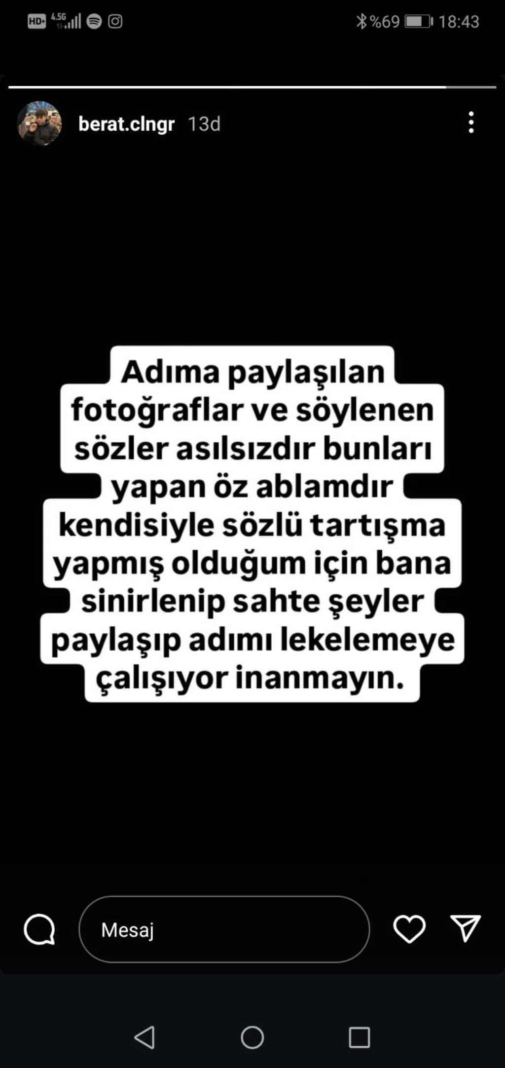 Berat Ç. ise ablasının paylaşımından sonra kendi hesabından yaptığı savunmasında "Adıma paylaşılan fotoğraflar ve söylenen sözler asılsızdır. Bunları yapan öz ablamdır. Kendisi ile sözlü tartışma yapmış olduğum için bana sinirlenip sahte şeyler paylaşıp adımı lekelemeye çalışıyor. İnanmayın” paylaşımını yaptı.